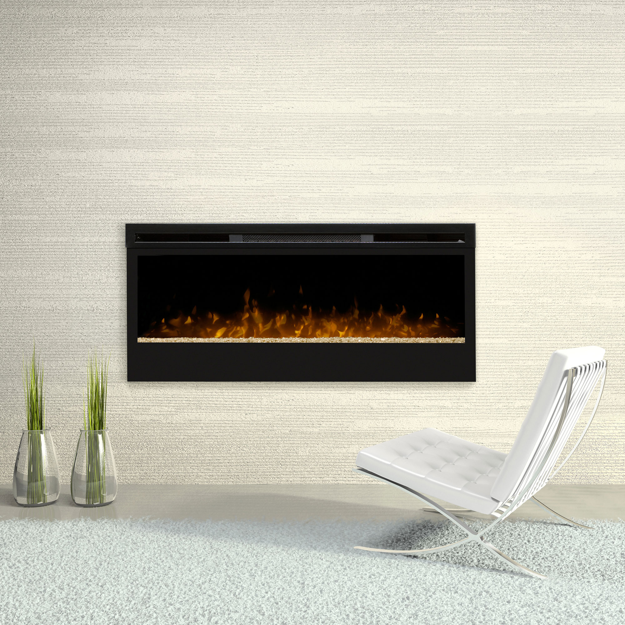 Dimplex prism 50 linear wall mount fireplace. Or you can recess your fireplace into the wall for a more finished and permanent design. The electric heater operates independently and can be set on low. The large 50 inch width viewing area, attractive black finish, incredible patented flame technology and beautiful glass ember bed makes this fireplace a must have for any home. The patented electric fire technology over crushed glass creates a highly realistic flame presentation.